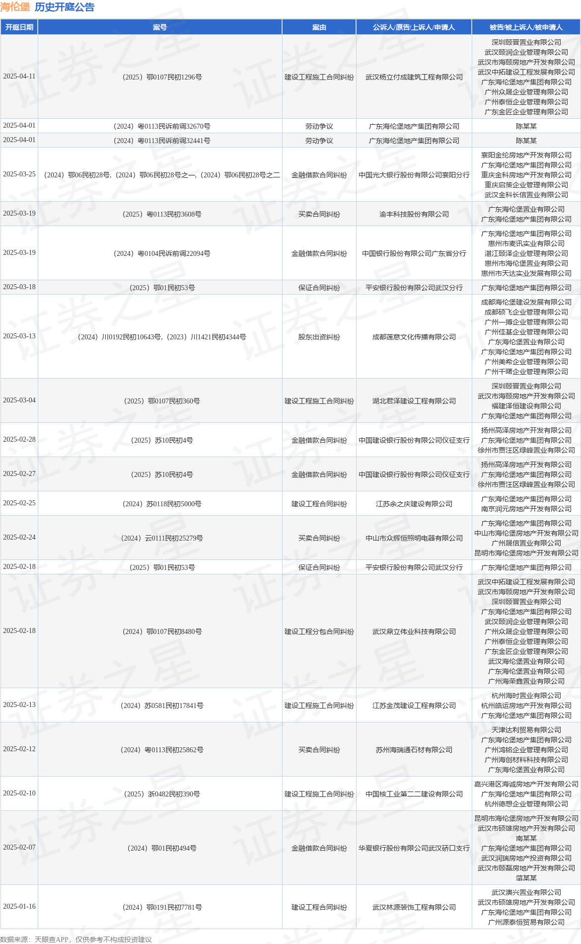 案号:(2024)苏0118民初5000号审理法院:南京市高淳区人民法院案由:建设工程合同纠纷当事人信息: 原告/上诉人:江苏余之庆建设有限公司 被告/被上诉人:广东海伦堡地产集团有限公司、南京润元房地产开发有限公司开庭日期:2025年2月25日根据统计,近一年内以广东海伦堡地产集团有限公司为当事人的历史开庭公告有163则,其中案由为“买卖合同纠纷”的公告以51则居首,其次为“建设工程施工合同纠纷”有34则,“金融借款合同纠纷”有17则。历史开庭公告(前20条)如下: